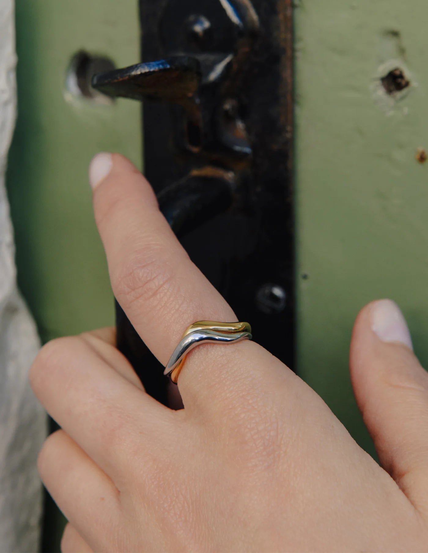 The gold and silver entwined ring features two fluid bands, one gold, one silver, interwoven into a single sculptural form. crafted with tarnish-free plating, it offers contrast and balance in a seamless, modern silhouette.