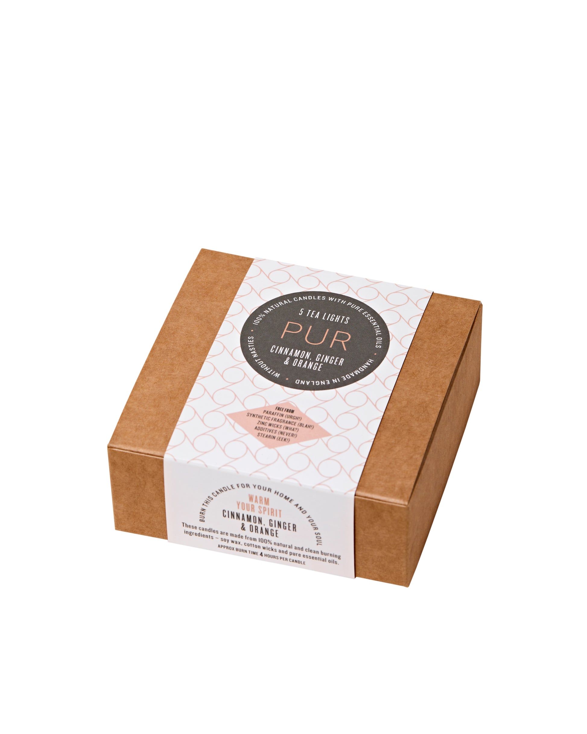 Made with soy wax, Cinnamon essential oil, Ginger essential oil, Orange essential oil & cotton wick.